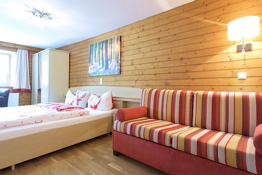 Die rustikalen Dreibett-Zimmer sind im typisch Tiroler Stil eingerichtet und sorgen mit viel Naturholz für echte Gemütlichkeit. Die Zimmer sind mit Parklettboden ausgestattet.