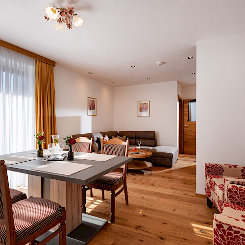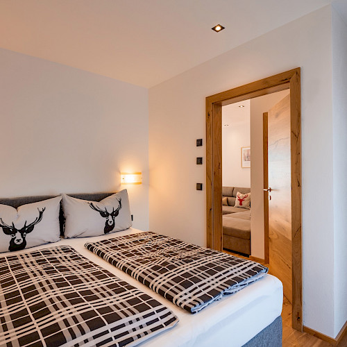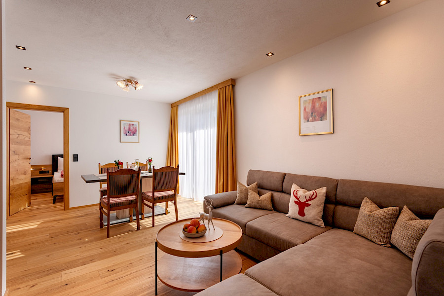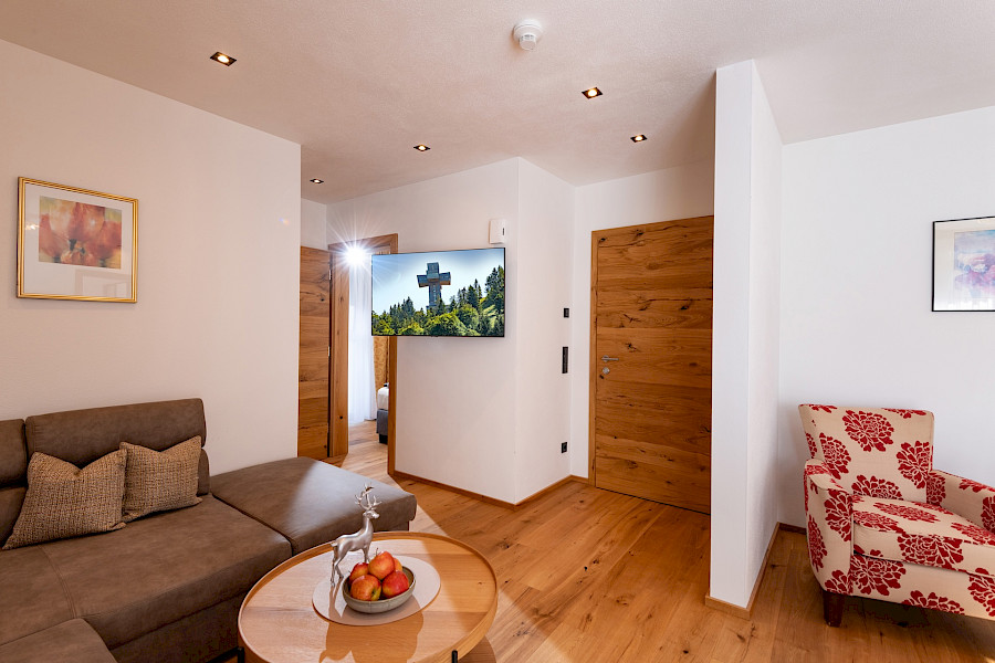 Unsere wunderschöne Suite im Neubau mit atemberaubendem Ausblick auf das Jakobskreuz und die umliegende Landschaft bietet zwei stilvoll eingerichtete Doppelzimmer und ein separates Wohnzimmer mit moderner Holzeinrichtung und einem großen Balkon. Ideal für Familien und Freunde, die Wert auf viel Platz und hohe Qualität legen.