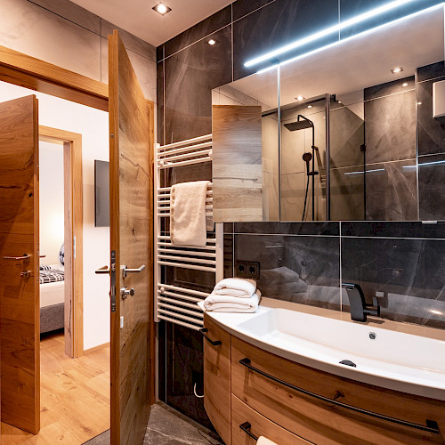 - Badezimmer mit moderner Dusche, elektronischen Heizkörper für warme und weiche Handtücher und viel Platz für persönliche Pflegeprodukte
